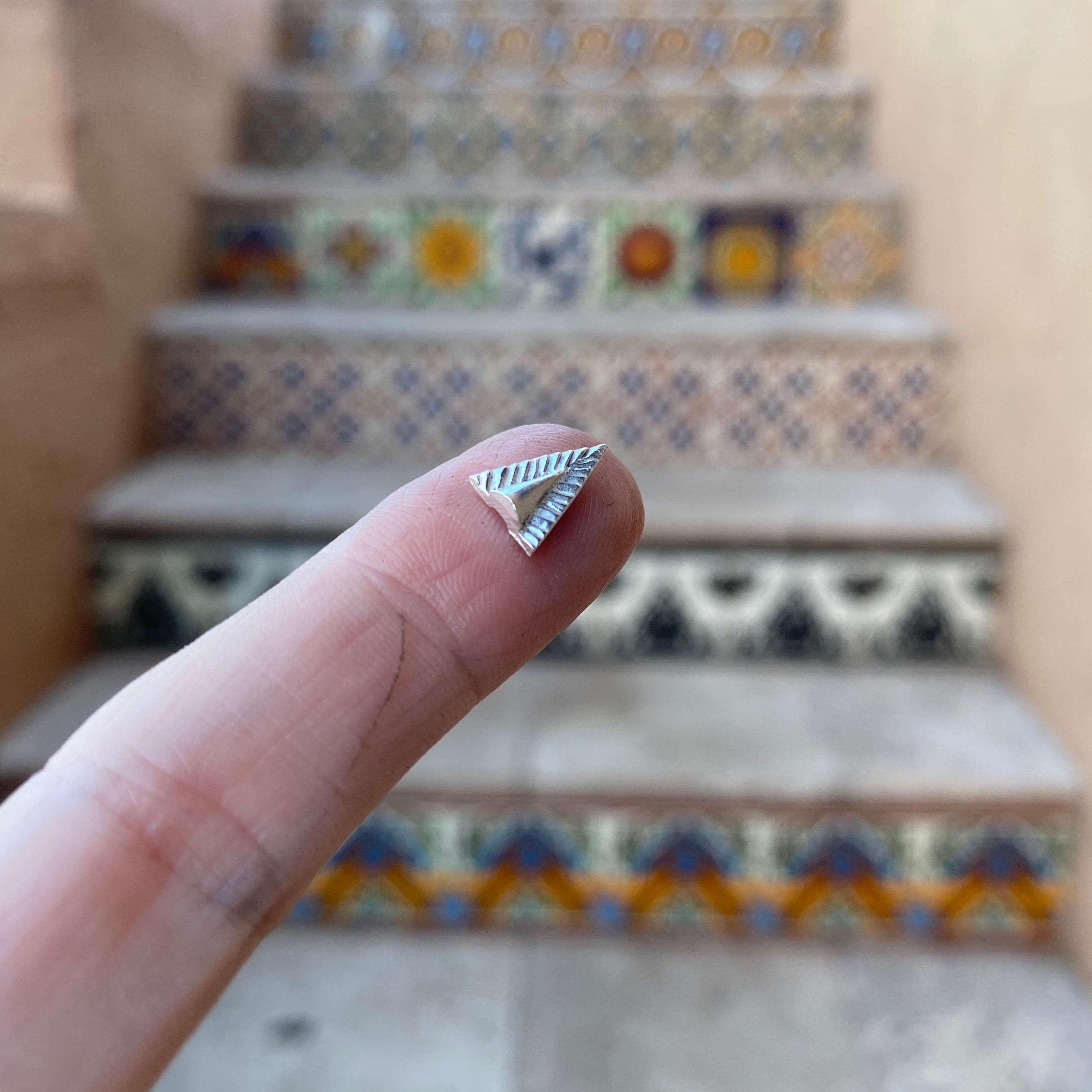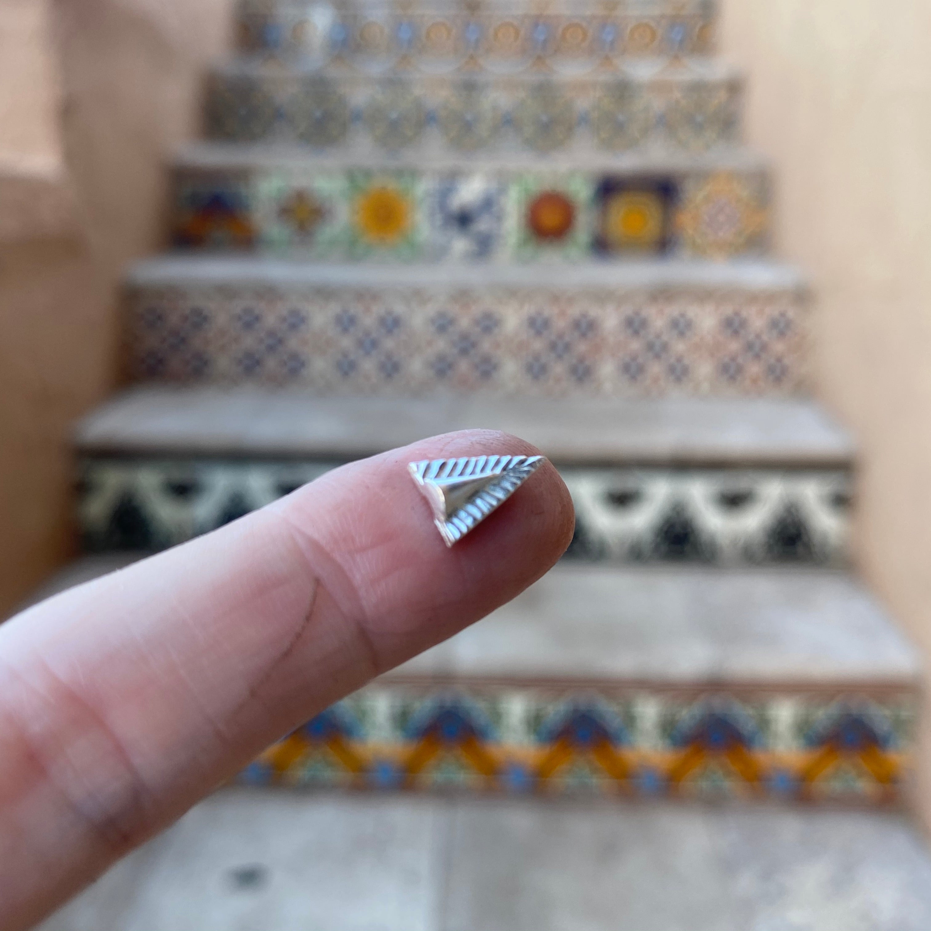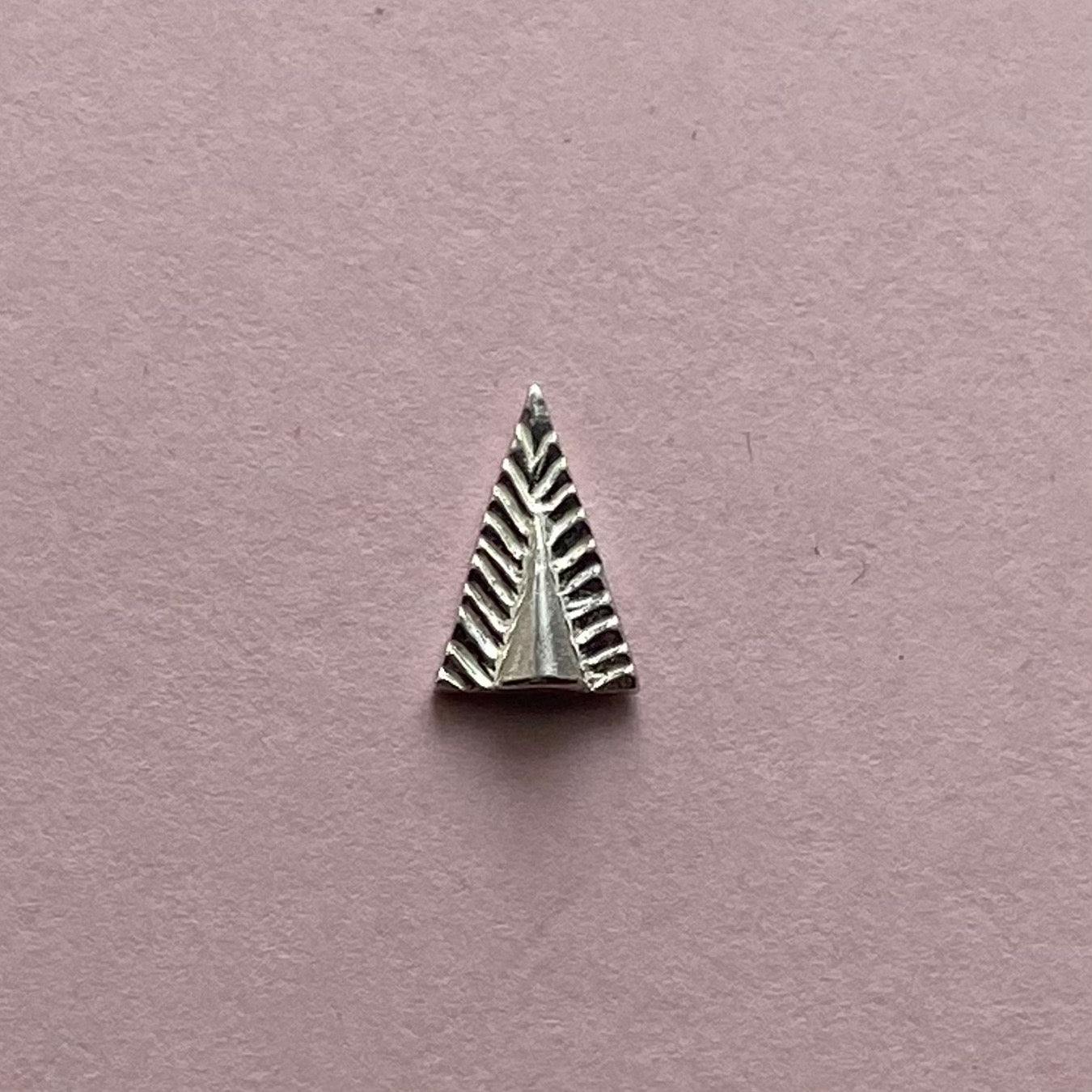 Sterling silver triangle casting. Ruffle texture surrounds a raised point in the center, this silver triangle is the high end version of a stamped design around your cabochon! The pattern and raised surface is just on the front, so it can easily be soldered up against your bezel. Approximately 10 mm tall. Price per each.