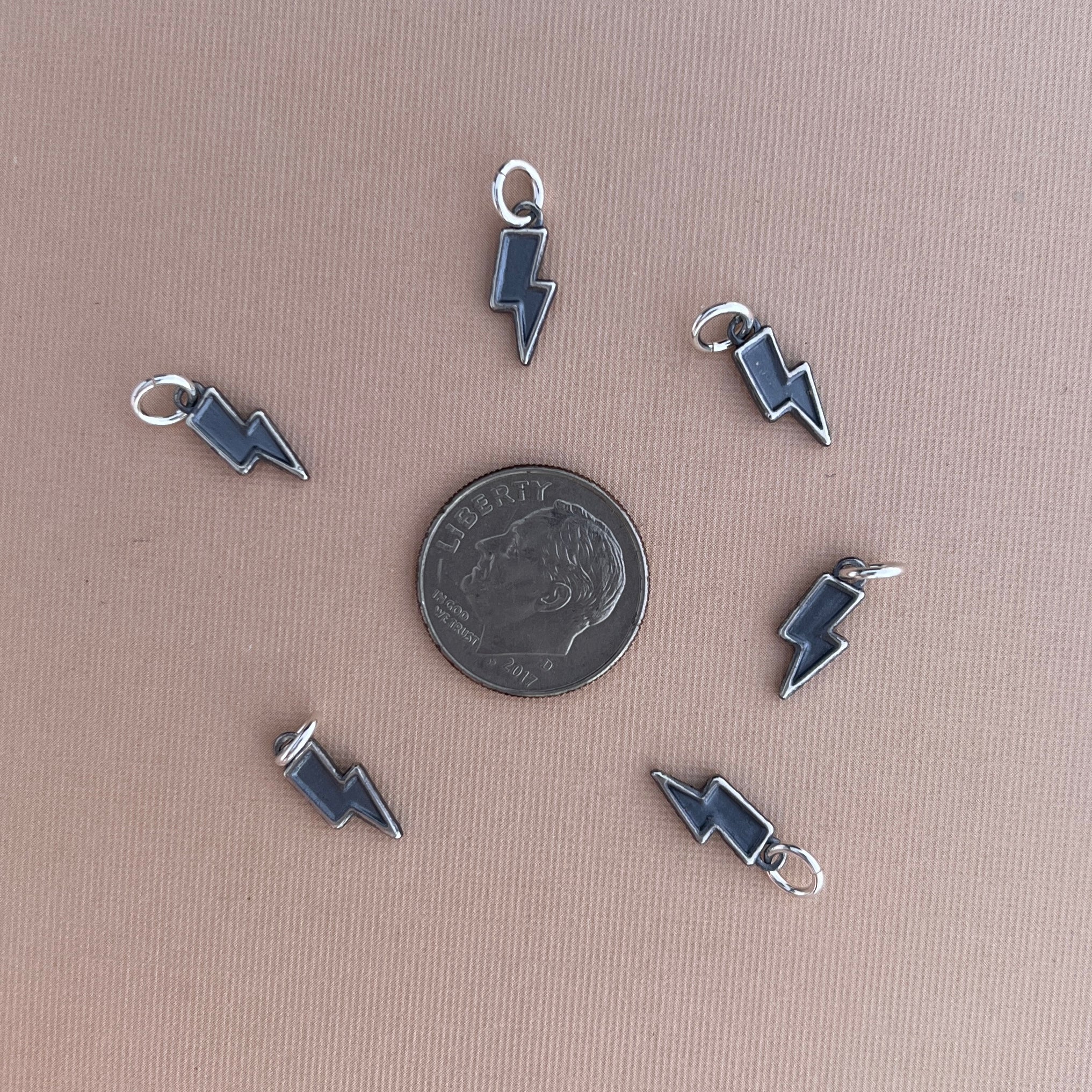 Concave lightning bolt charm in silver. Textured on front and back so you can see the design on both sides. With patina and a jump ring already applied, all you need to do is add it to your bracelet or necklace! It has a closed loop you can easily fit an 18 gauge wire or jump ring through. It comes with a 5mm, 19 gauge jump ring that you can attach to something or take off if you like.