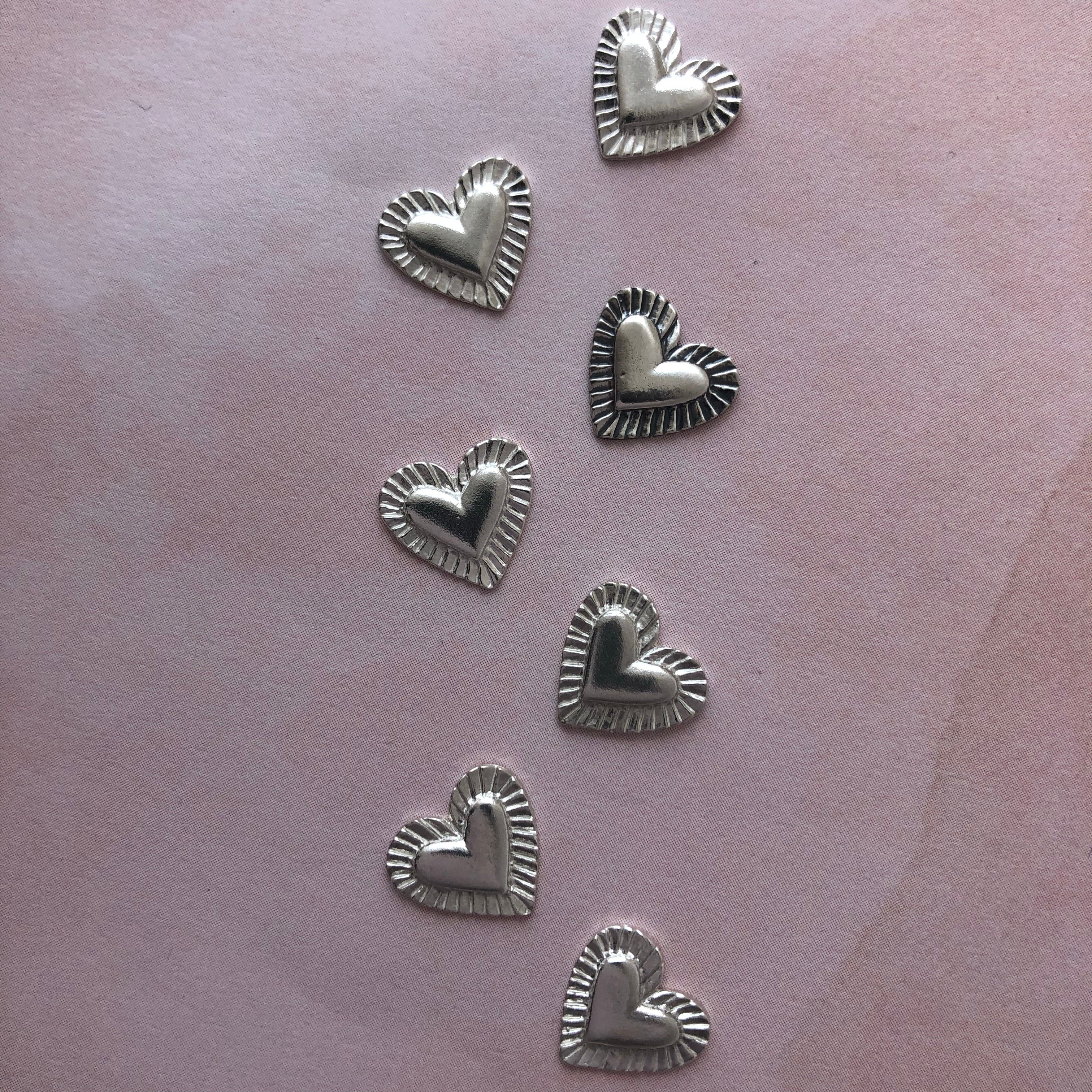 This silver ruffled heart was inspired by the concho. Outside the raised heart in the center, it has a ruffled border that shows patina beautifully and a heart shaped hollow in the back that keeps its weight down. Price per each.