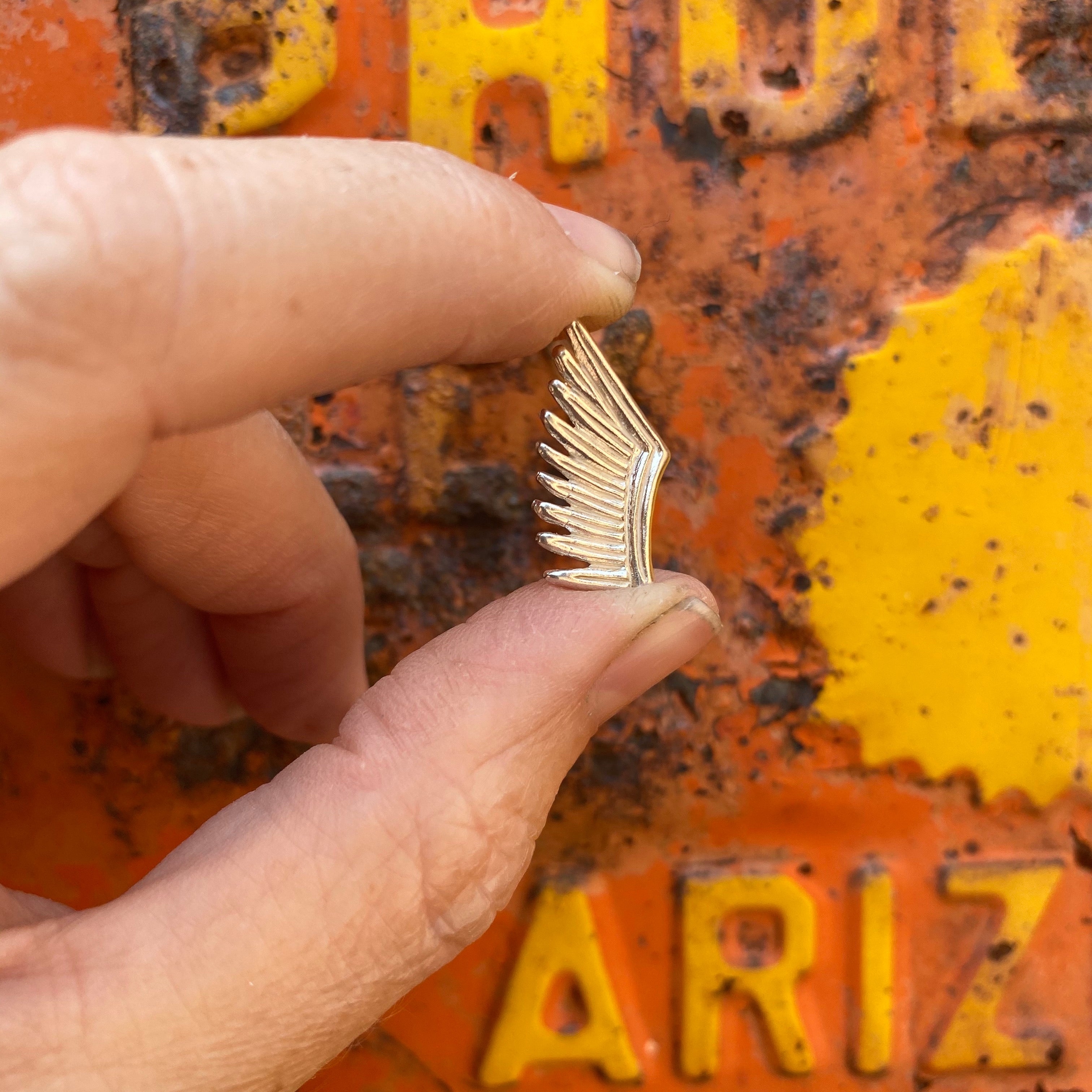 Use this silver wing up against your heart cabochon, on a ring or other silversmithing project to stand out. Our silver wing is 3/4 of an inch long, both sides have a pattern on them, so you can flip it over and see the same beautiful design on the back side. and was hand carved at our studio in Phoenix, AZ.  Price per piece.