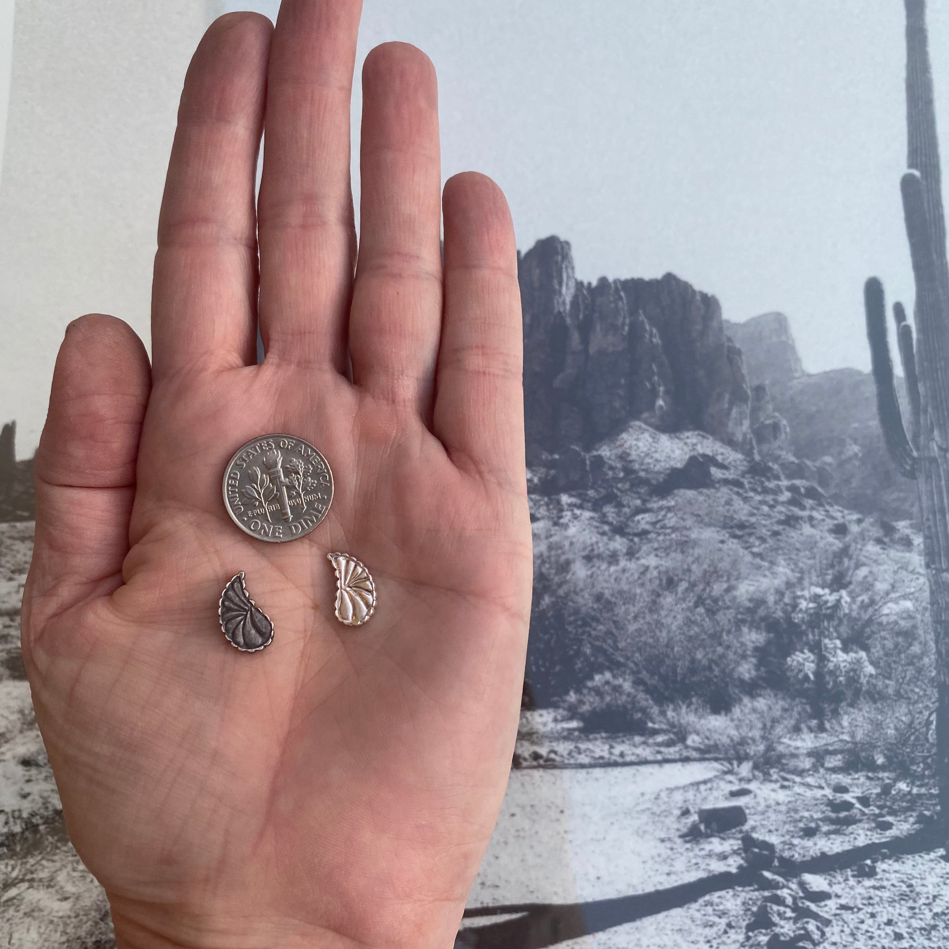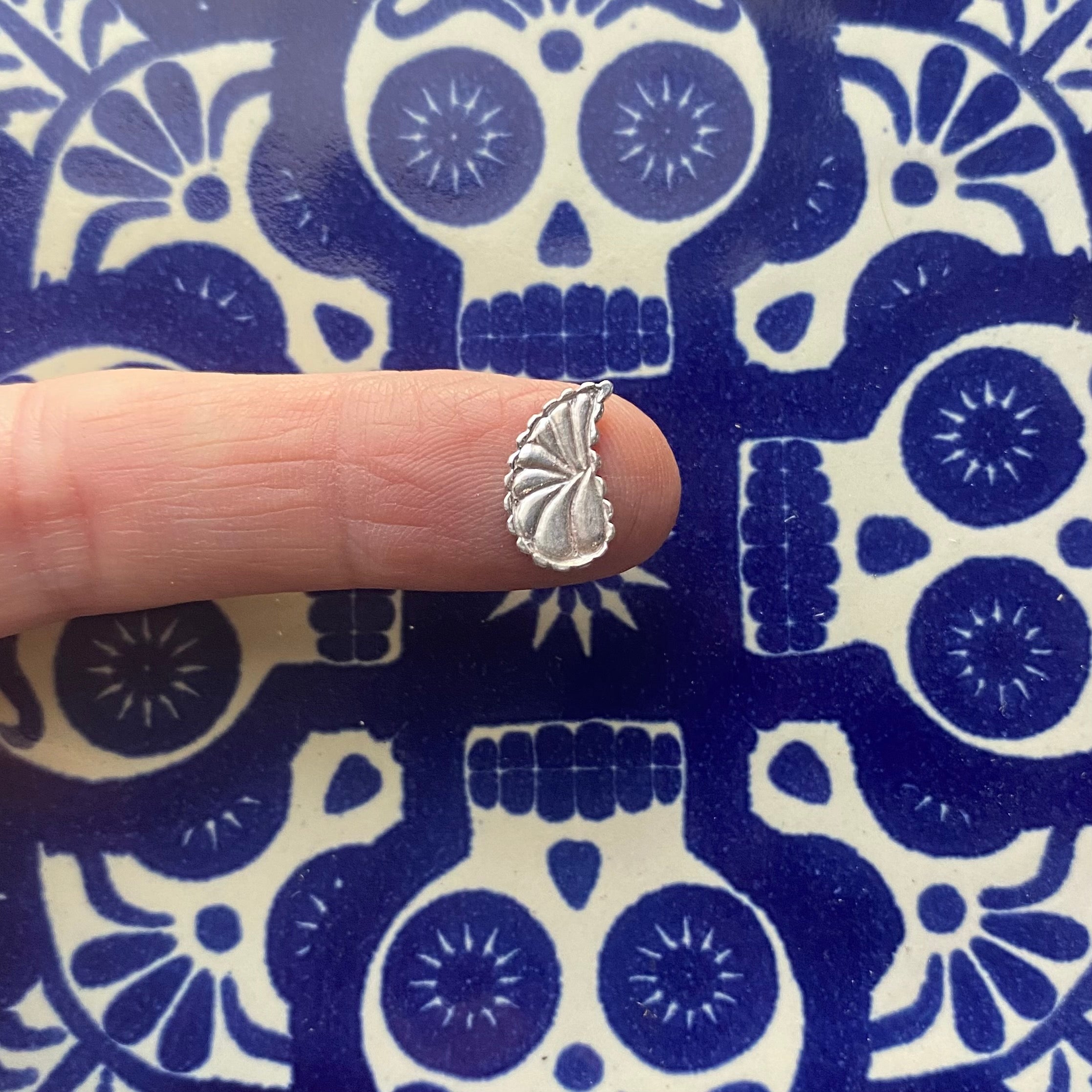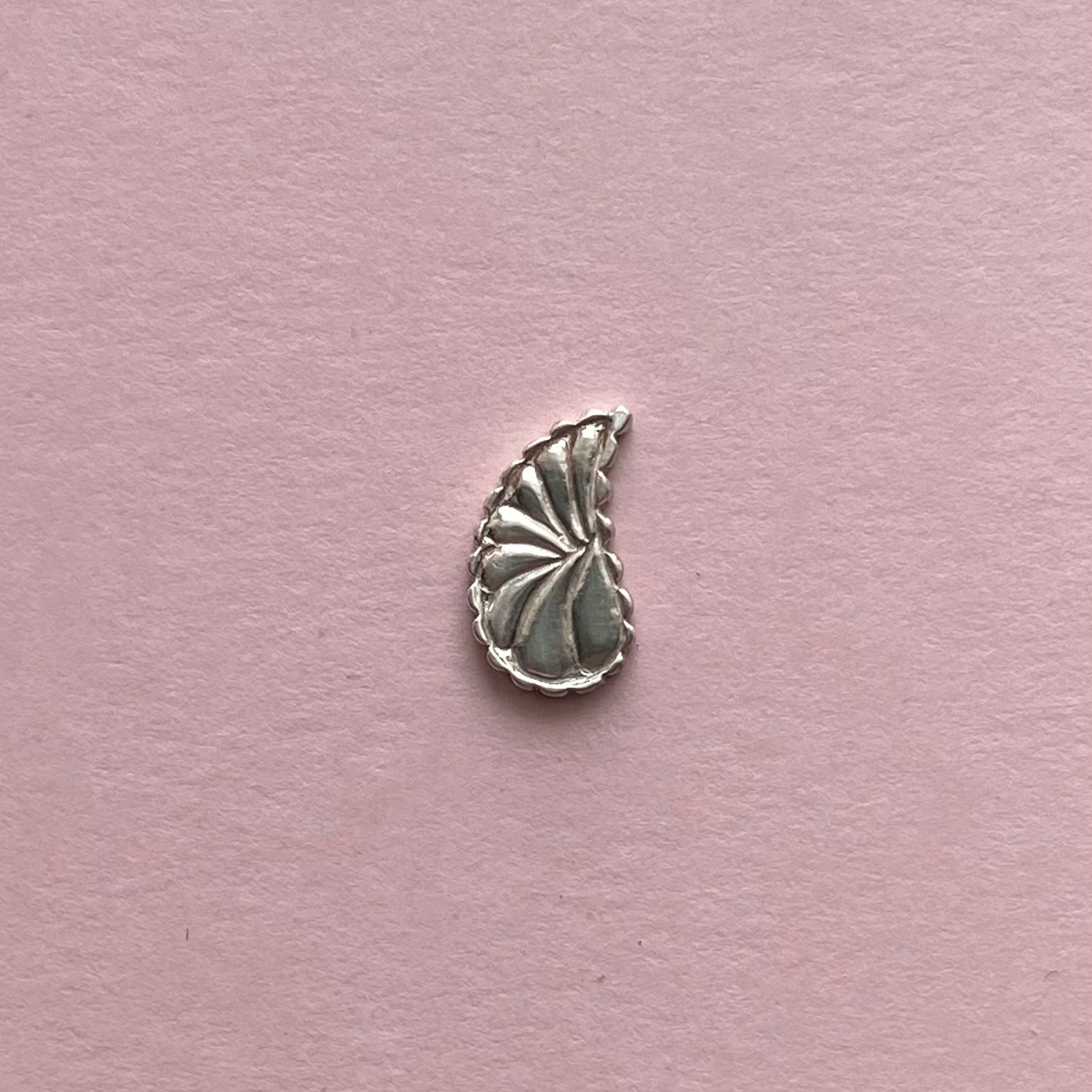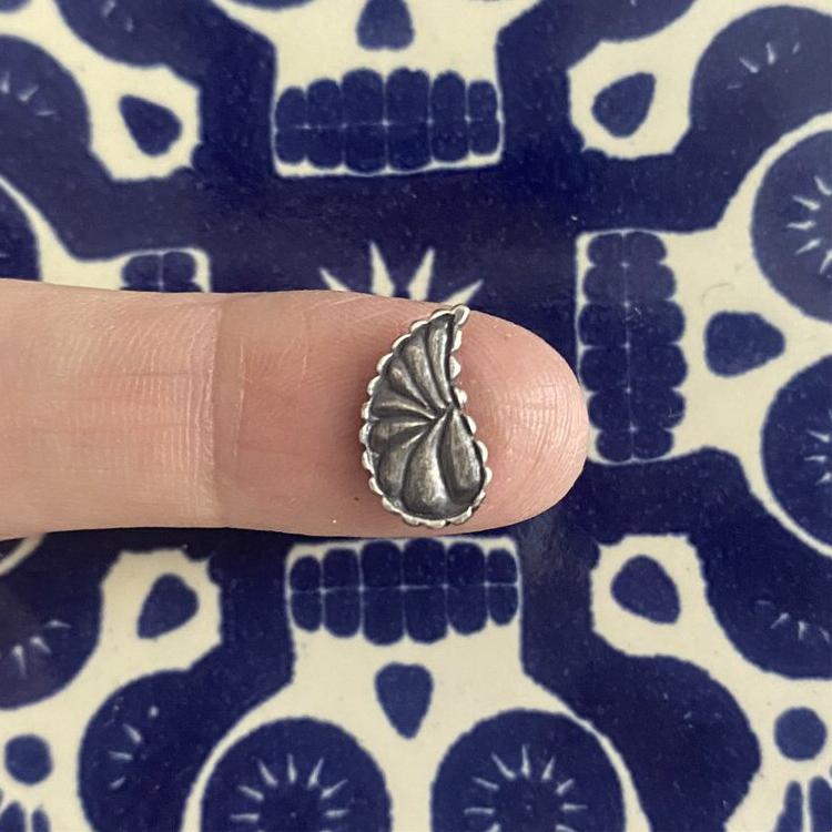 Sterling silver embellishment casting. This detailed embellishment was inspired by the classic bohemian print textile. This silver accent is perfect for giving your next cabochon ring or pendant more detail and dimension. The pattern is on both sides allowing for a perfect mirrored image when you use two. Price per each.