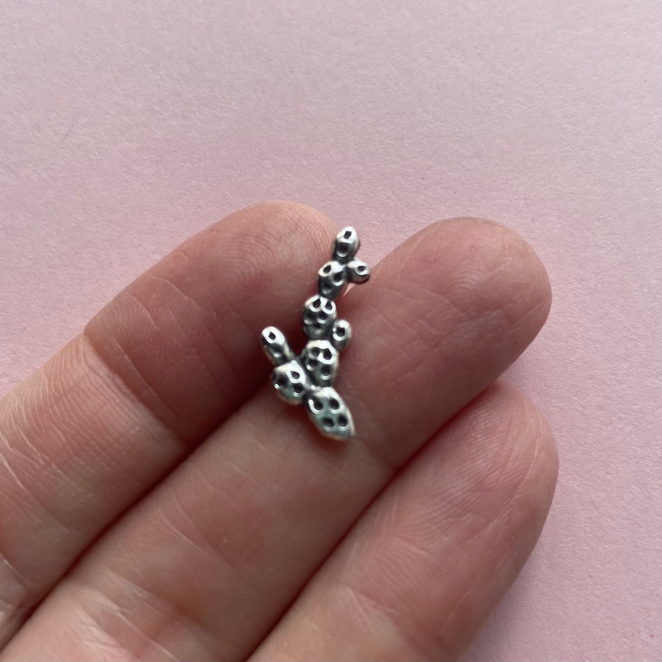 Sterling silver prickly pear. Carved from hard wax to look like the iconic cactus, this casting has a pattern on front and back, making it easy to flip and look fantastic. Put it up against a cabochon, turn it into stud earrings, make a ring shank! We can't wait to see what you do with this. This necklace is just an example of the many ways you can use this casting. Approximately 17mm diameter. Price per each.